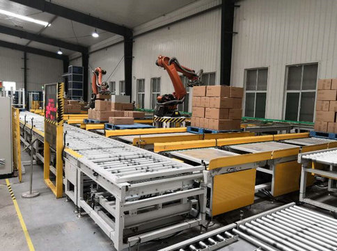 將產品通過進料輸送帶輸送進料,機器人及夾具到產品上方,抓取產品后移動到棧板位,按事先輸入的碼垛形式進行產品碼放。